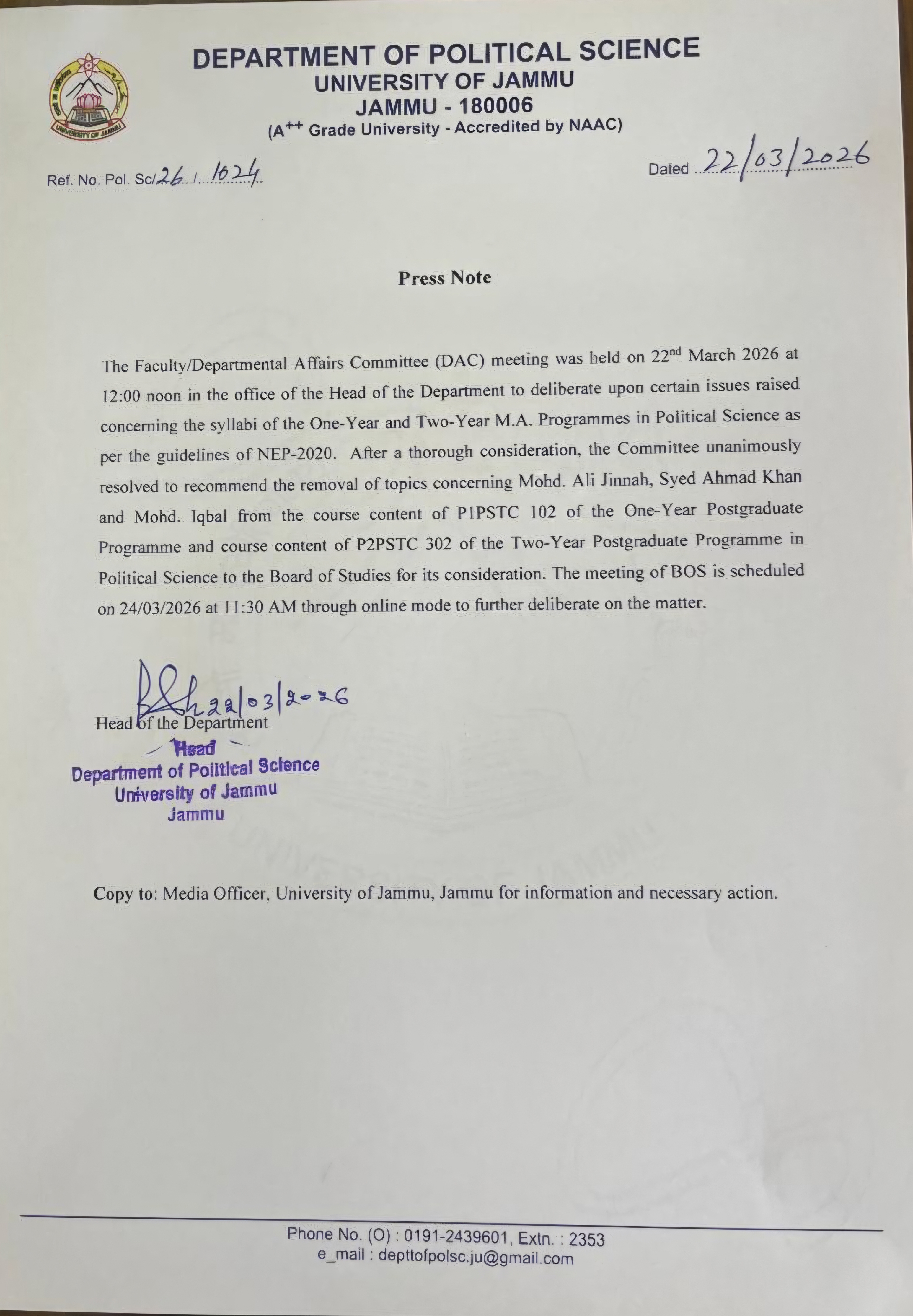 According to an official press note issued by the department, a meeting of the Faculty/Departmental Affairs Committee (DAC) was held on March 22, 2026, at 12:00 noon in the office of the Head of the Department. The meeting focused on reviewing the syllabi of the One-Year and Two-Year M.A. programmes in Political Science in alignment with the guidelines of the National Education Policy (NEP) 2020.