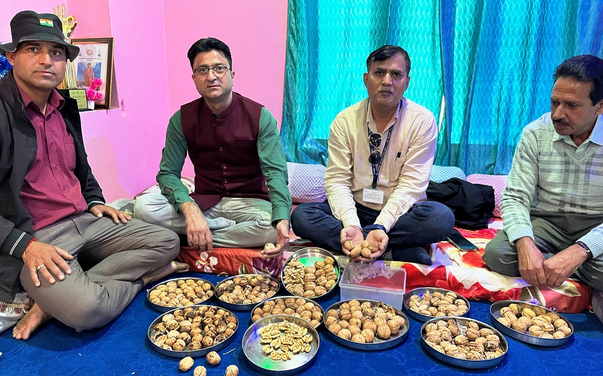 Suneel Singh advocating walnut cultivation as a superior alternative to apple because of its resilience to weather vagaries, organic nature, low-input friendly, suitable for dry temperate conditions, no need of cold storage, limited post-harvest losses, ease of transportation, higher plant life (>200 years), higher market value (Rs 400-500/kg shelled and Rs 1200-1400/kg for kernel), market for by-products like green hull, shell, pellicle, oil etc.