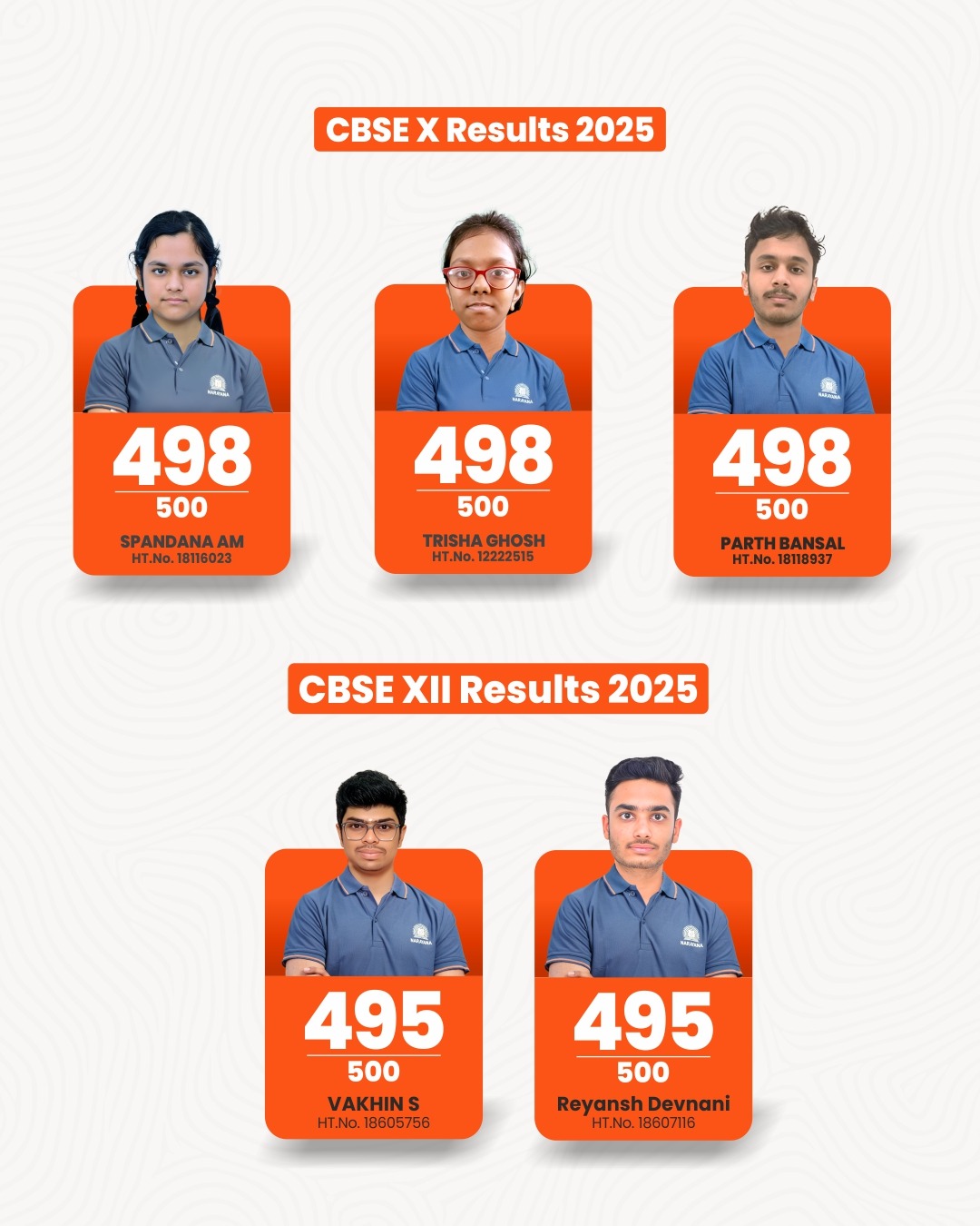 Demonstrating Narayanaâs consistent commitment to academic success, 17 students scored above 495 marks in Class 10, with 111 students securing above 490and the overall pass percentage stood at an impressive 99.6. In Class 12, 17 students crossed the 490 mark, these results stand as a testament to Narayanaâs dedication to nurturing excellence and empowering students to achieve their academic dreams.