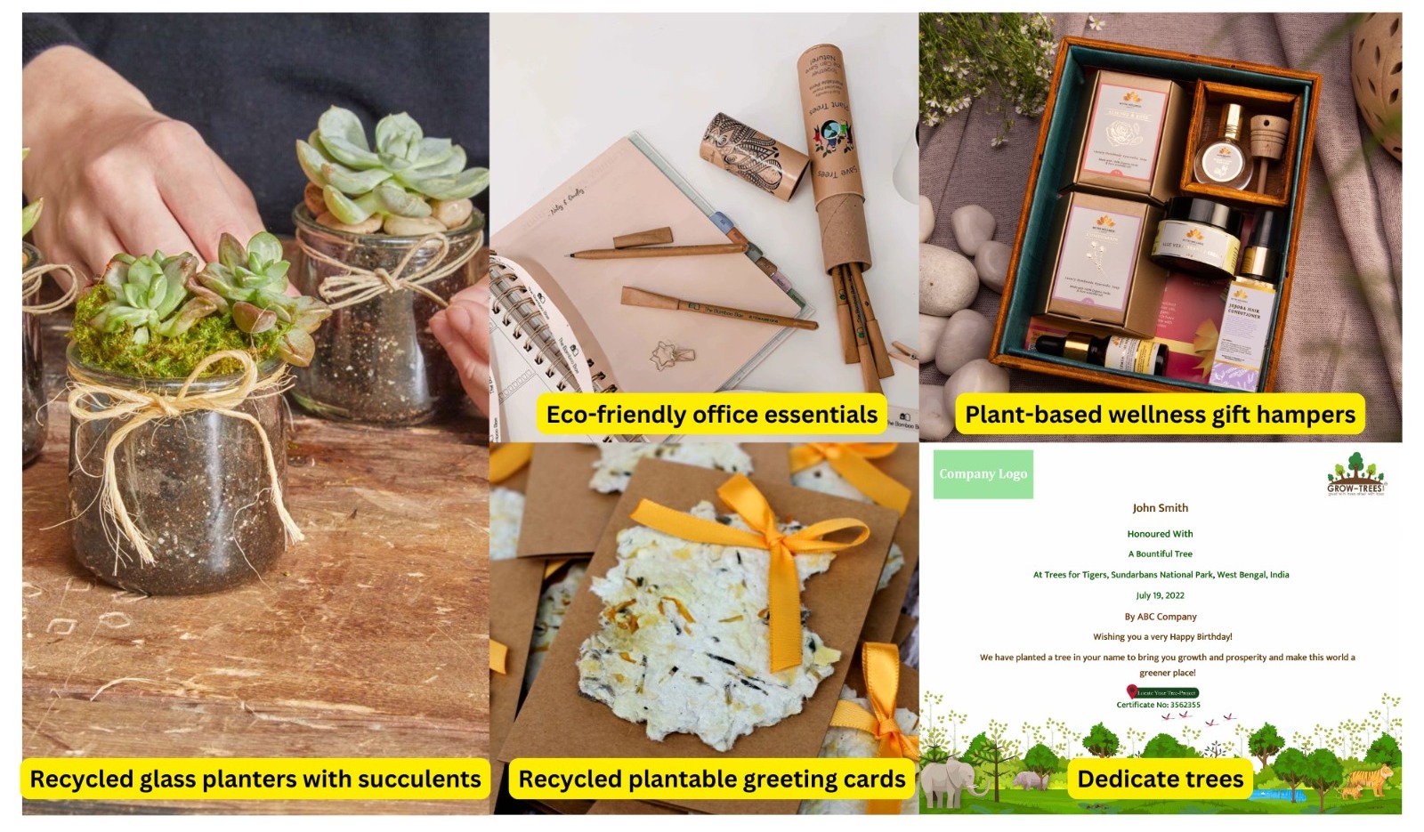 Offering gift hampers to employees is a common practice in many corporate offices. These hampers can be thoughtfully crafted with a focus on eco-friendliness. For example, a package filled with plant-based products such as organic teas, natural skincare items, vegan snacks, and organic chocolates infused with real fruit pieces makes for a perfect, health-focused offering. Some online platforms offer curated hampers with ceramic mugs, organic tea tins, sweet chili cashews in reusable jars, soy wax coconut candles and berry blast chocolate bars that are 100% organic.Recycled plantable greeting cards