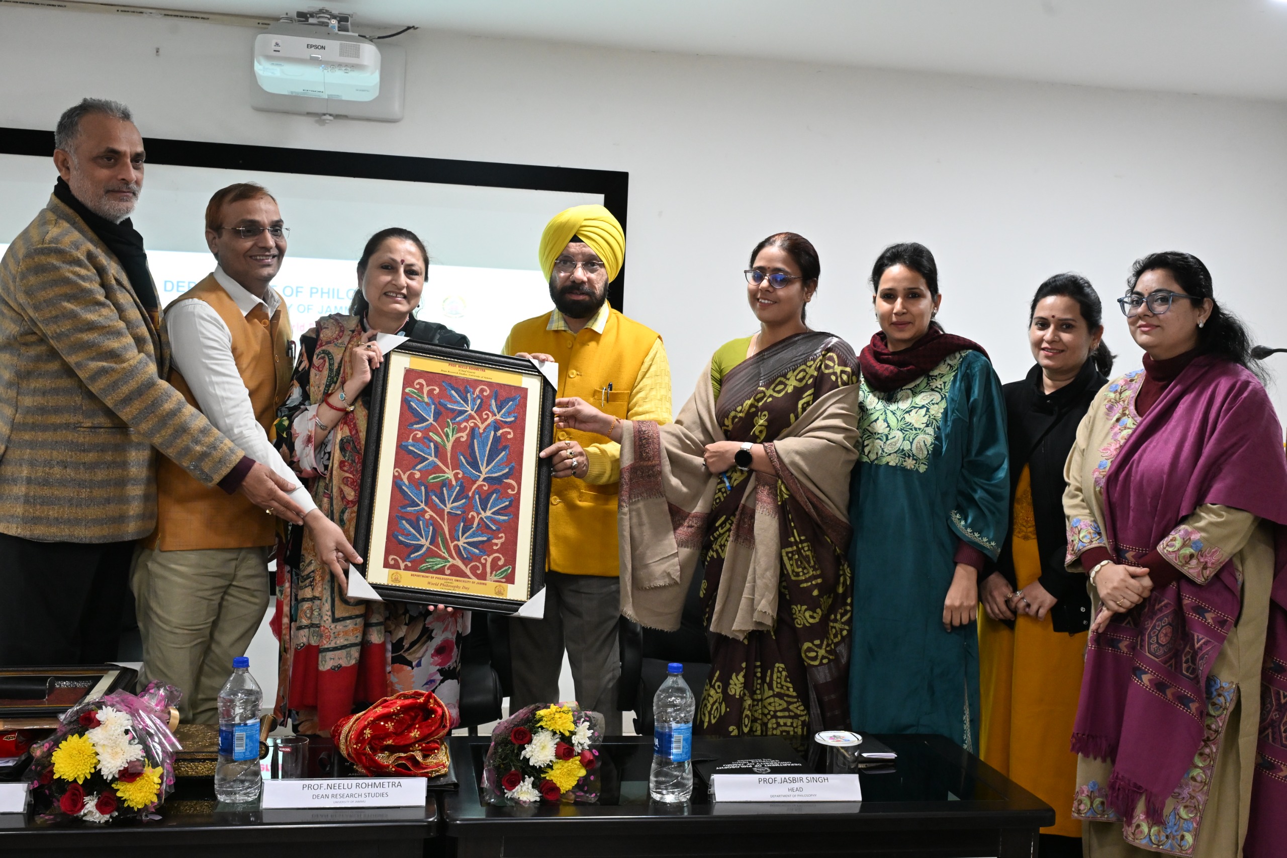 Prof. Sharma stressed that the philosophy of Kashmir Śaivism not only facilitates reverence for Śiva—the supreme consciousness—but also illuminates both the conscious and unconscious dimensions of the self, offering guidance in thought and action. Earlier, Prof. Jasbir Singh, Head, Department of Philosophy, formally welcomed the guests and introduced the concept behind organizing the lecture. Dr. Ajai Kumar Mishra, Assistant Professor, introduced the speaker. Dr. Panu Sharma, Assistant Professor, delivered the vote of thanks, while Dr. Vijay Laxmi Rai, Assistant Professor, conducted the proceedings.